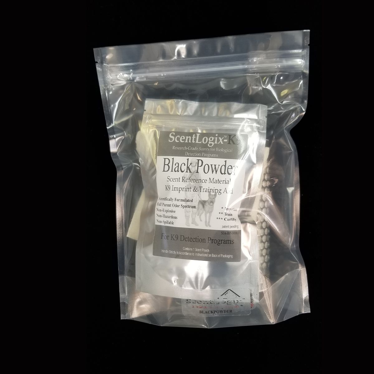 O Sachê de aroma sintetizado não explosivo ScentLogix Pólvora Negra deve ser utilizado para formação e manutenção de treinamento de cães de detecção de Pólvora Negra.
